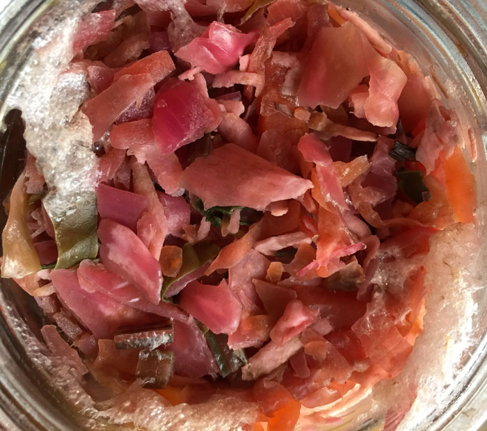 Kimchi de col morada, papanabo, rábano y jícama.
